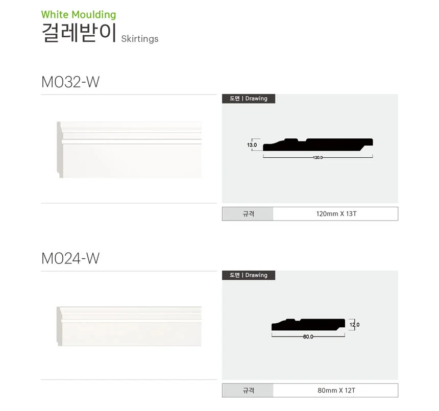 걸레받이 | 120mm, 80mm | M032-W, M024-W INFO Type 걸레받이 Size(width*height) M032-W 120x13TM024-W 80x12T Pattern WHITE