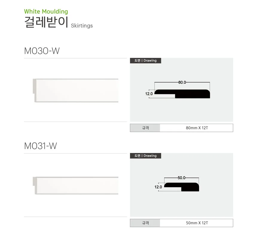 걸레받이 | 80mm, 50mm | M030-W, M031-W INFO Type 걸레받이 Size(width*height) M030-W 80x12TM031-W 50x12T Pattern WHITE