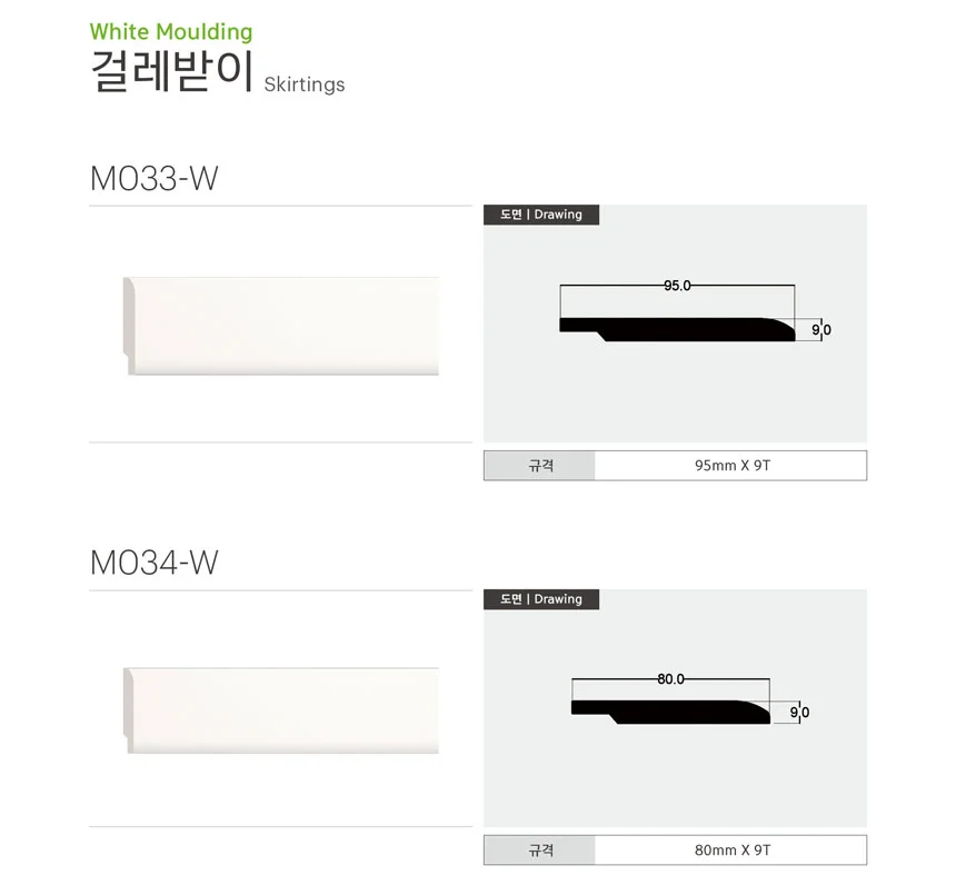 걸레받이 | 95mm, 80mm | M033-W, M034-W INFO Type 걸레받이 Size(width*height) M033-W 95x9TM034-W 80x9T Pattern WHITE
