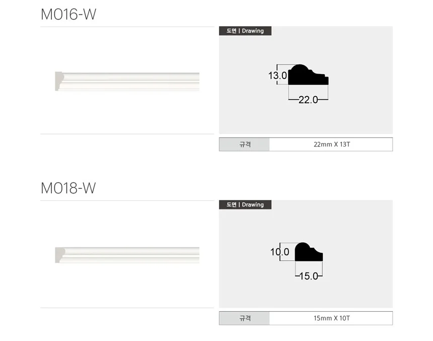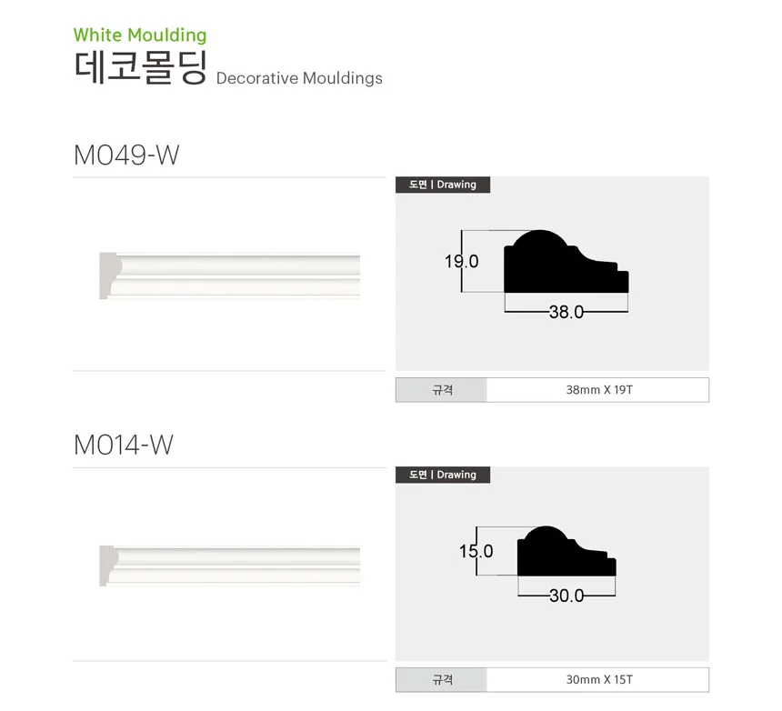 데코몰딩 | 38~15mm | M049-W, M014-W, M016-W, M018-W INFO Type 데코몰딩 Size(width*height) M049-W 38x19TM014-W 30x15TM016-W 22x13TM018-W 15x10T Pattern WHITE