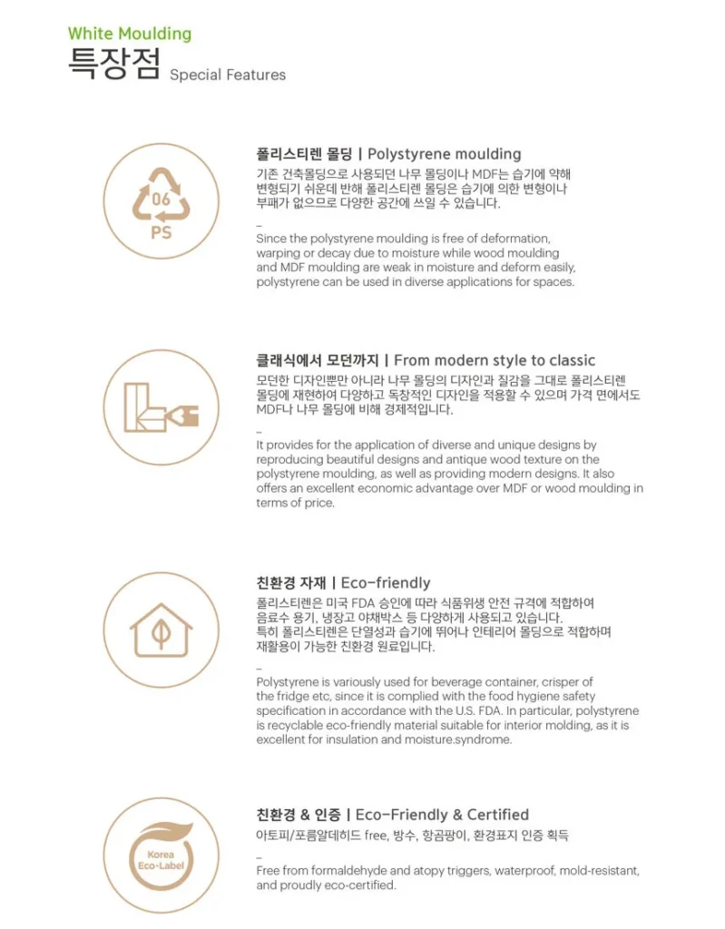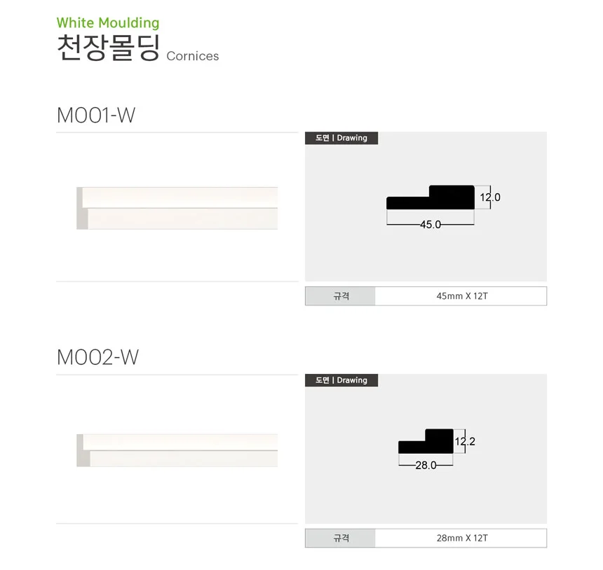 천장몰딩 | 45mm, 28mm | M001-W, M002-W INFO Type 천장몰딩 Size(width*height) M001-W 45x12TM002-W 28x12T Pattern WHITE