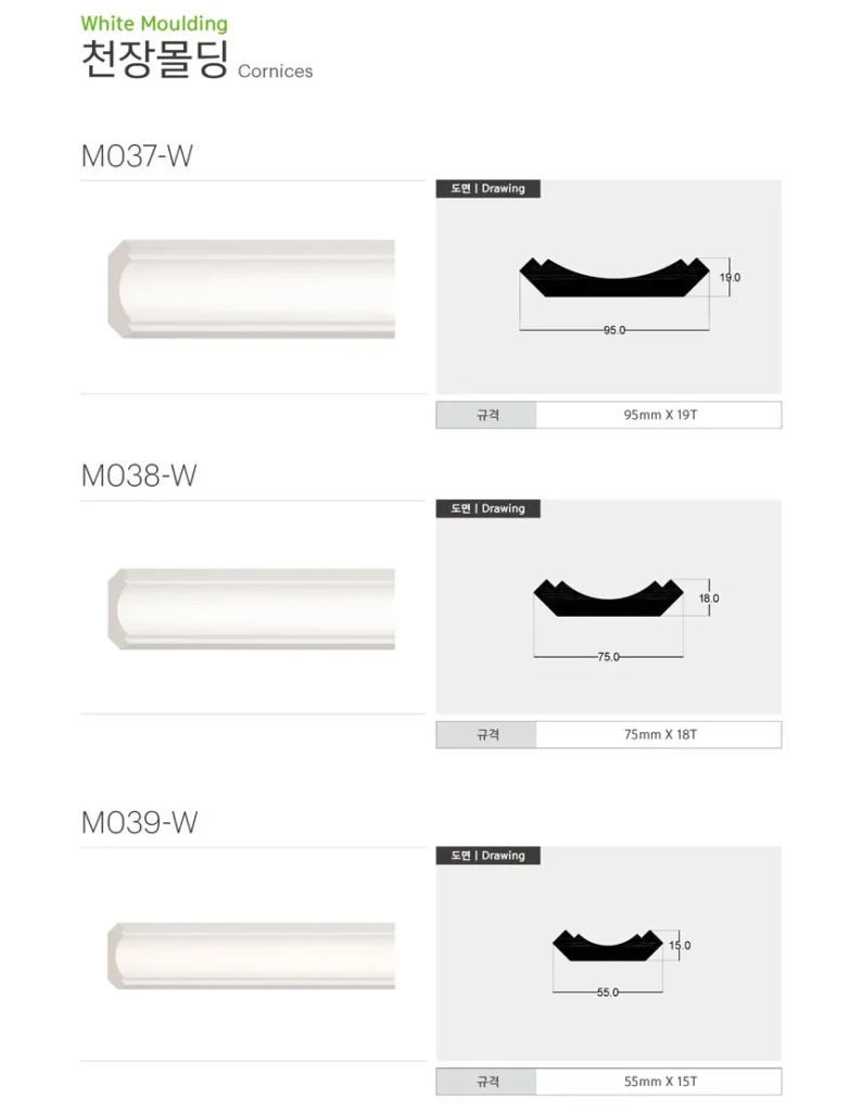 천장몰딩 | 95mm, 75mm, 55mm | M037-W, M038-W, M039-W INFO Type 천장몰딩 Size(width*height) M037-W 95x19TM038-W 75x18TM039-W 55x15T Pattern WHIRE